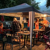 The night buzzed with activity. A dozen or more people revelled in food and drink, while children’s laughter echoed through the air.