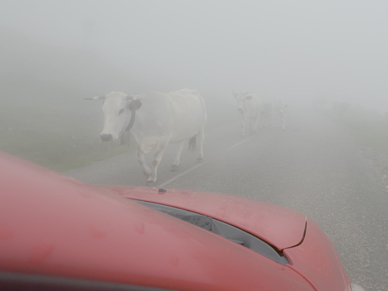 Through the cloud, I could hear the soft clang of cowbells, but when they emerged from the cloud in front of the car, it shocked me.